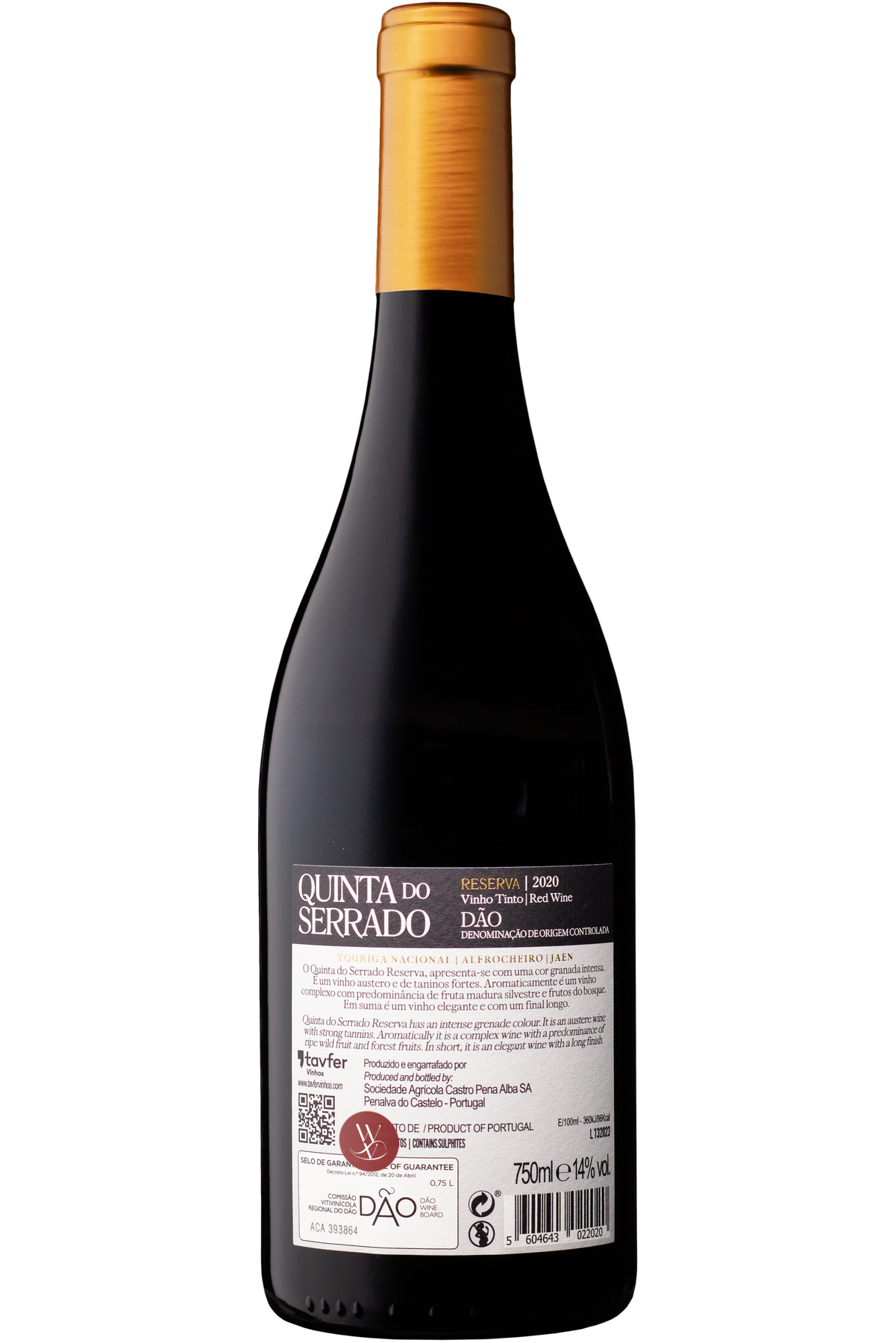 O Quinta do Serrado Reserva Tinto 2020 é um vinho elaborado a partir das castas Touriga Nacional, Alfrocheiro e Jaen, com fermentação e maceração que extraem cor e textura intensas. Apresenta uma cor opaca e aromas marcantes de frutos pretos, café e baunilha. Na boca, revela-se guloso e persistente, ideal para acompanhar pratos tradicionais da cozinha portuguesa. Deve ser servido entre 16-18ºC. Reconhecido pela crítica, já recebeu 16,5 pontos da Revista de Vinhos e a Grande Medalha de Ouro no Concours Mondial de Bruxelles em colheitas anteriores.